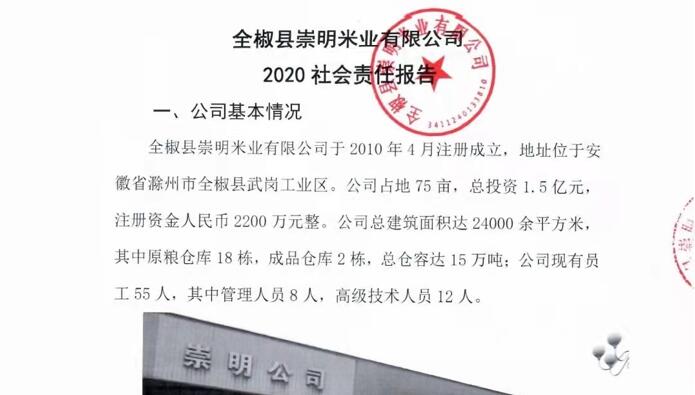 全椒县崇明米业有限公司于2010年4月注册成立,总投资1.5亿元,注册资金2200万元整,公司占地75亩,总建筑面积达24000余平方米,其中包含18栋原粮仓库,2栋成品仓库,总仓容达15万吨,主营业务包括粮食收购、大米加工销售、粮食仓储;拥有2条大米生产线,一条自动化大米生产流水线,日加工稻谷400吨,和一条糙米生产线,日加工稻谷600吨,年加工稻谷能力达30万吨。
