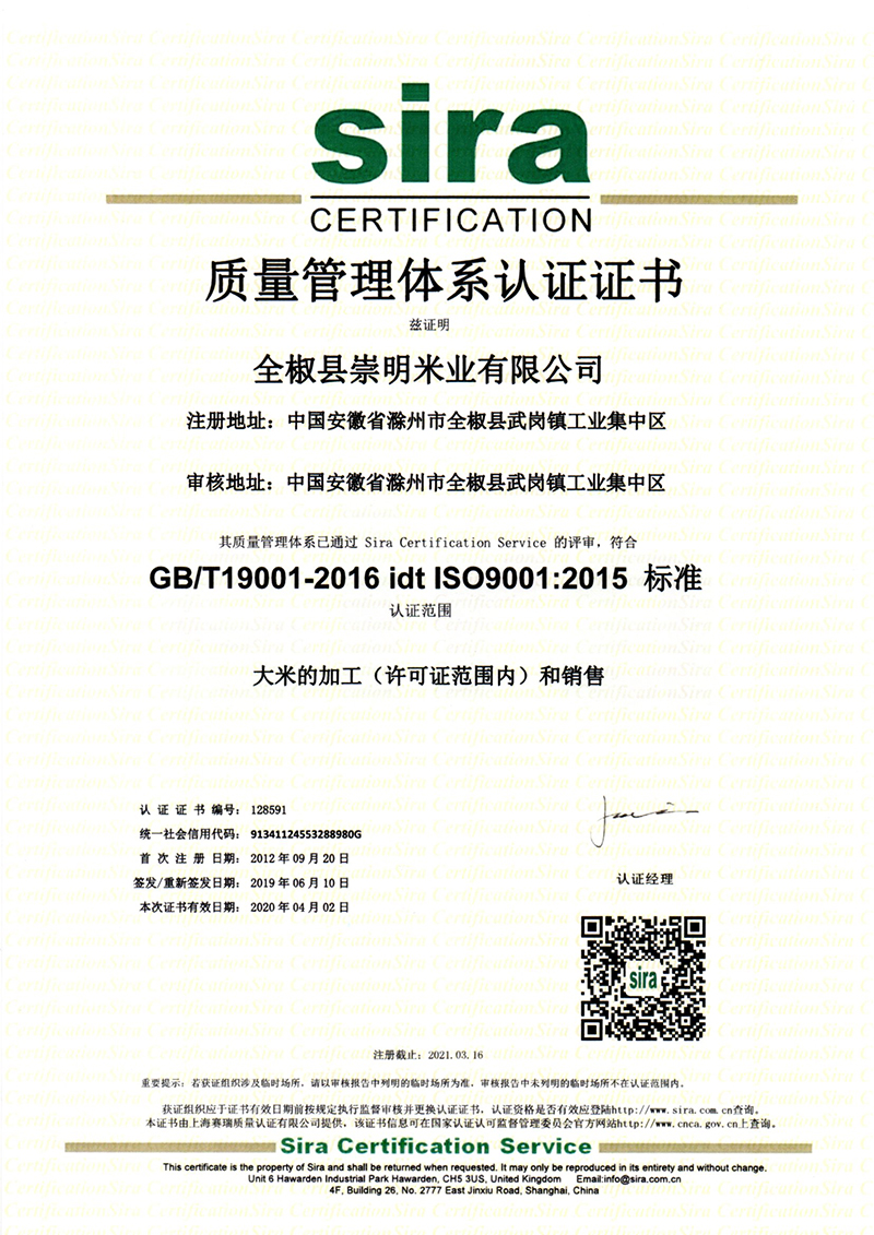 质量管理体系认证证书